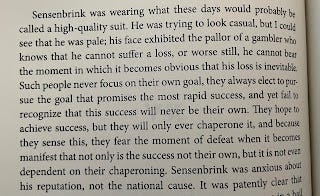 “His face exhibited the pallor of a gambler who knows that he cannot suffer a loss, or worse still, he cannot bear the moment in which it becomes obvious that his loss is inevitable. Such people never focus on their own goal, they always elect to pursue the goal that promises the most rapid success, and yet fail to recognize that this success will never be their own. They hope to achieve success, but they will only ever chaperone it, and because they sense this, they fear the moment of defeat when it becomes manifest that not only is the success not their own, but it is not even dependent on their chaperoning. Sensenbrink was anxious about his reputation, not the national cause.”