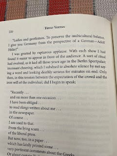 “I was greeted by rapturous applause. With each show I had found it easier to appear in front of the audience. A sort of ritual had evolved, as it had all those years ago in the Berlin Sportpalast incessant cheering, which I subdued to absolute silence by not saying a word and looking deathly serious for minutes on end. Only then, in this tension between the expectation of the crowd and the iron will of the individual, did I begin to speak.”